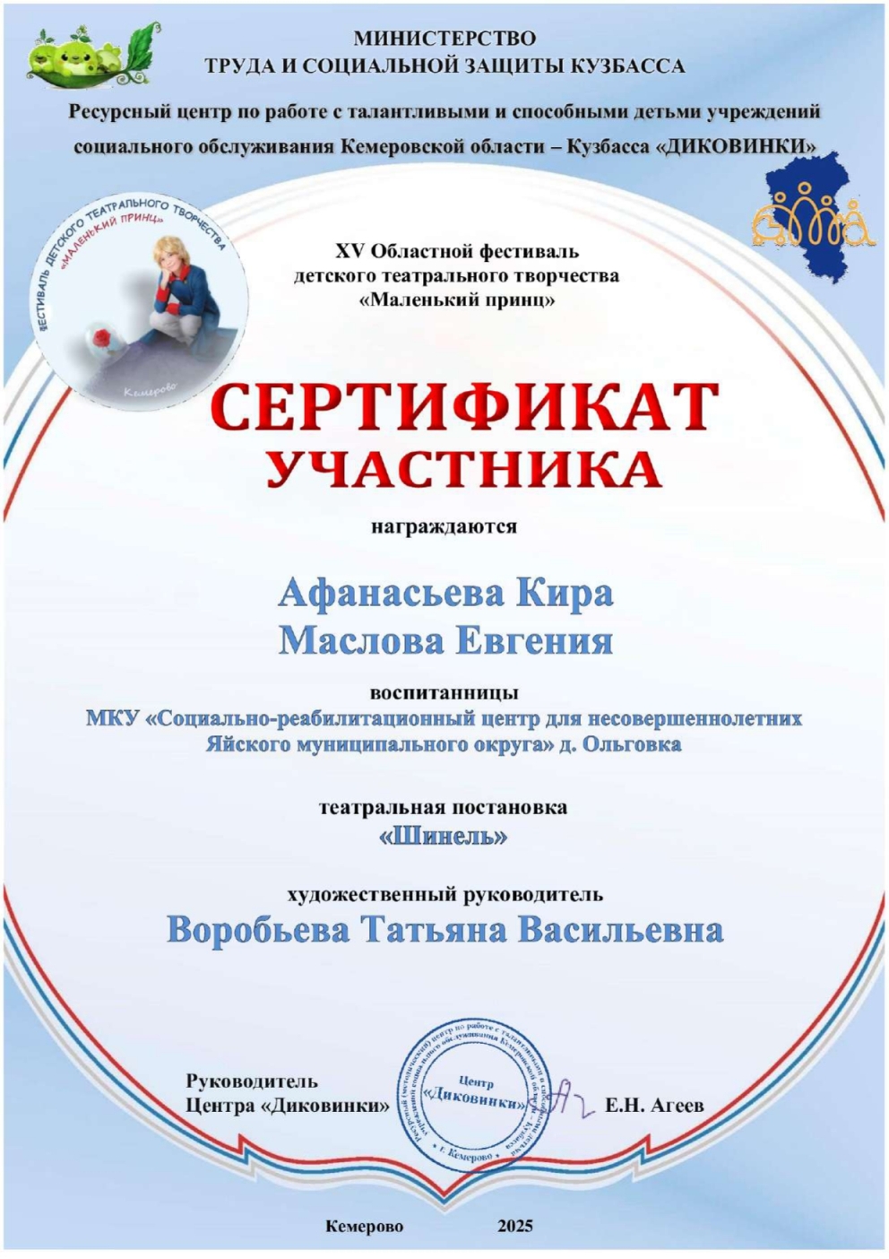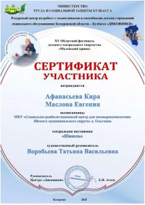 Афанасьева Кира и Маслова Евгения, воспитанницы МКУ «СРЦ для несовершеннолетних» под руководством воспитателя Воробьёвой Татьяны Васильевны приняли участие в XV Областном фестивале театрального творчества «Маленький принц», за что были отмечены сертификатом. Молодцы.