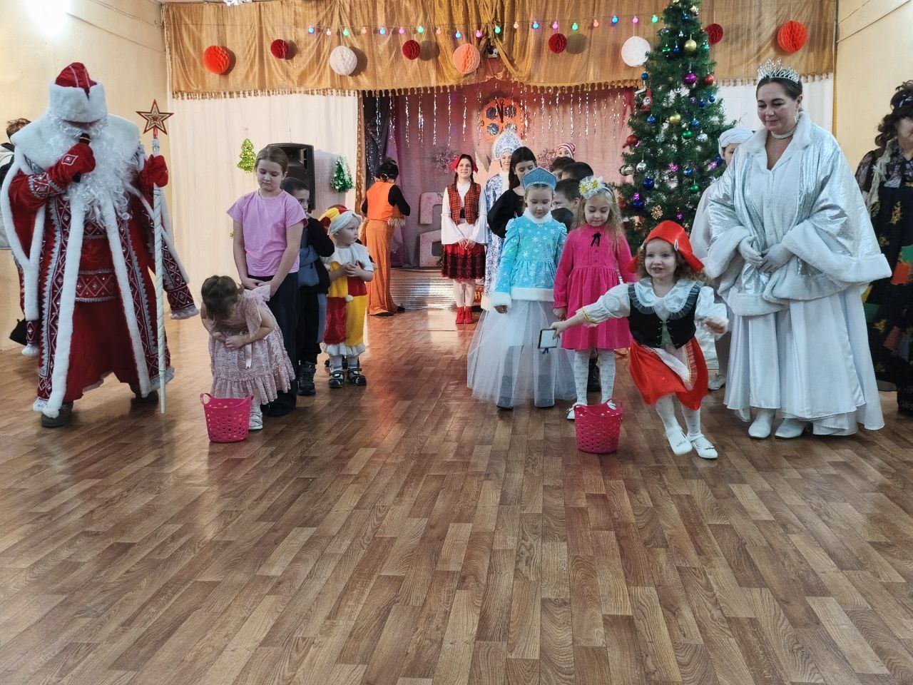 Веселая игровая программа пригласила всех в сказочный мир. Ребята встретились с Дедом Морозом и Снегурочкой, Снежной королевой и Бабой Ягой, Красной шапочкой и Волком, лисой Алисой и Буратино. Дети окунулись в водоворот событий со сказочными героями – выручали в трудных ситуациях, помогали пройти испытания, играли, танцевали, водили хороводы. Разноцветные, сверкающие гирлянды и ярко украшенная ёлочка принесли детям ощущение чуда, и все дети получили сладкий подарок от Деда Мороза.
